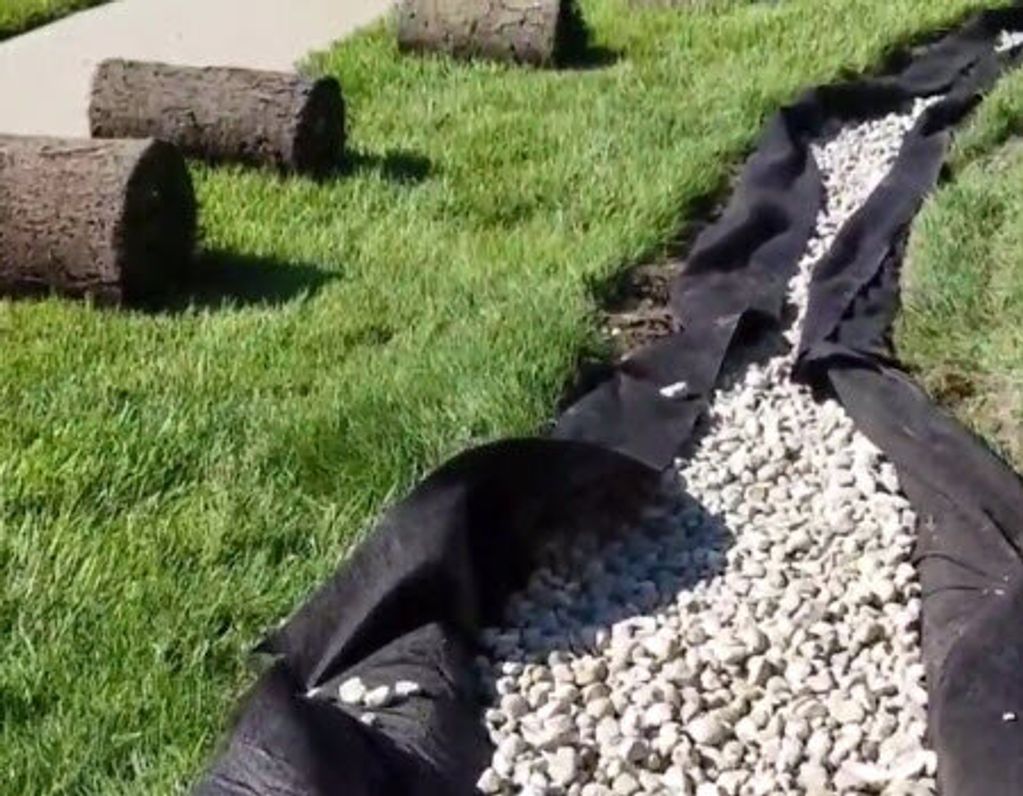 After the pipe is laid and the trench backfilled with rock we "burrito " the fabric over the top to seal everything up and the sod is laid back over the top.